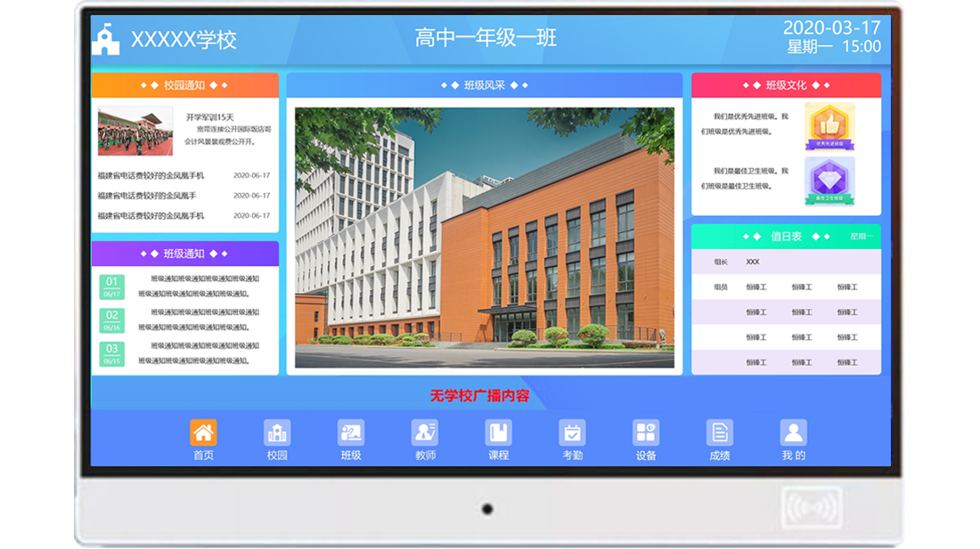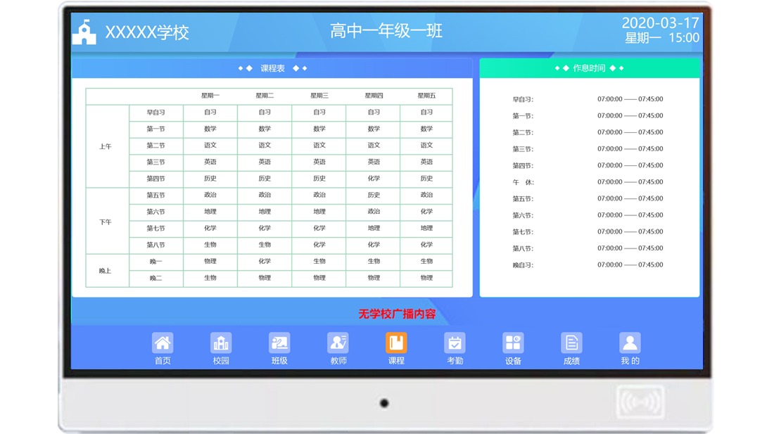 對所在班級的課程安排以及學(xué)校的作息時間的展示,讓師生合理安排時間,增強時間觀念。